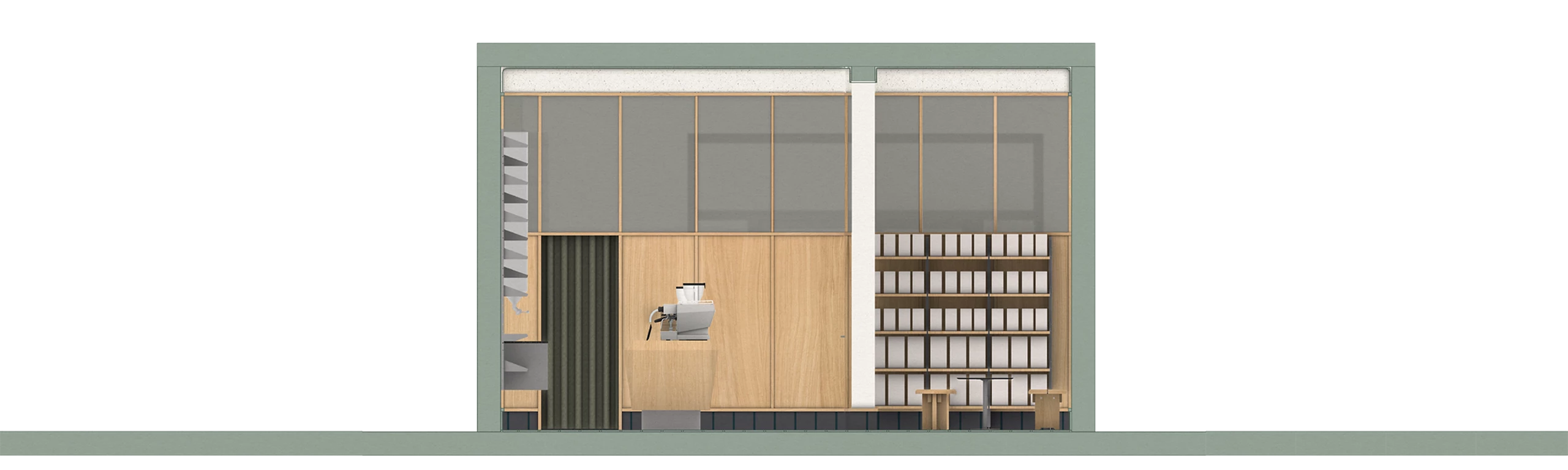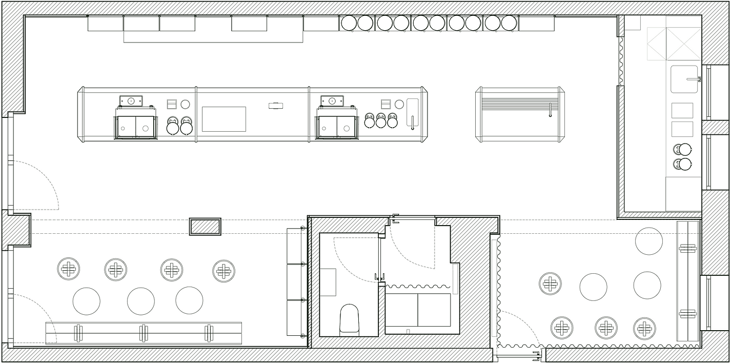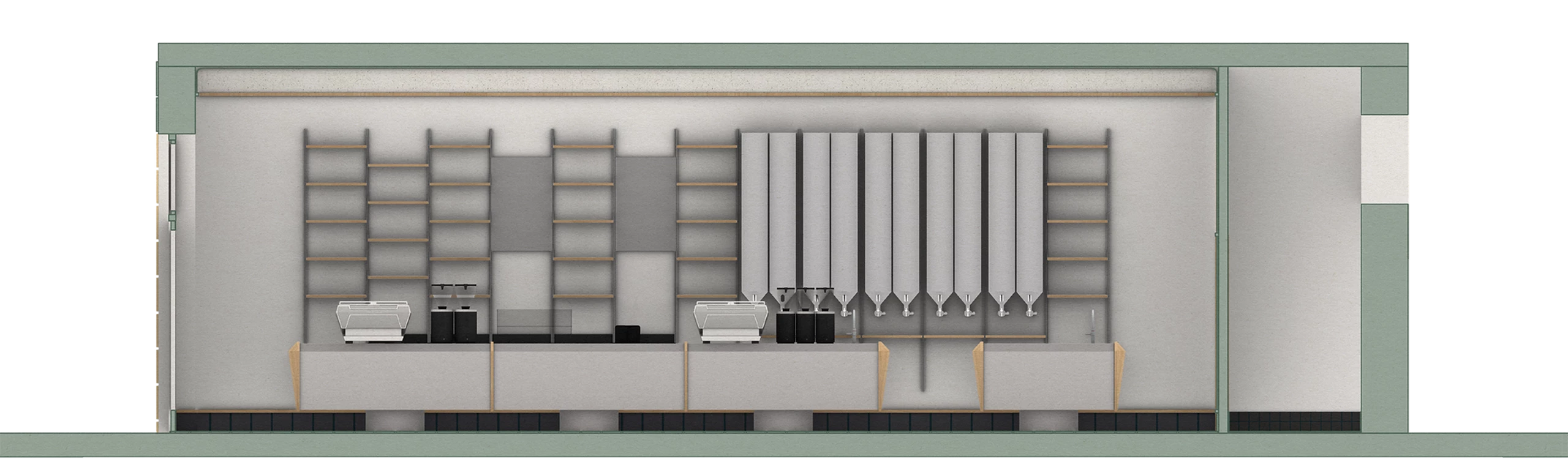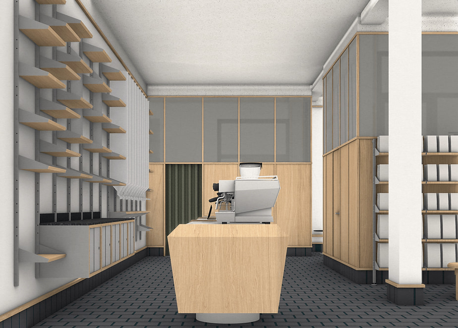For the fourth Berlin branch of the Bonanza coffee roasting company, a small shop in Berlin-Mitte that previously had no gastronomic function was converted into a café. This made the new installation of all necessary connections of the counter, which only stands on cylinders, as well as a small preparation kitchen a special challenge.