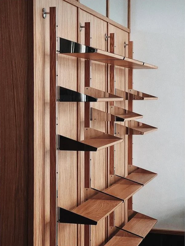 Warm wood tones and soft textiles were contrasted with the reflective metal of the counter and the shelving elements. Mirrored surfaces in the upper half of the room contribute to a visual enlargement. The strikingly angled parts of the counter and the module shelving system are custom-made and were specially designed for Bonanza products and workflows.