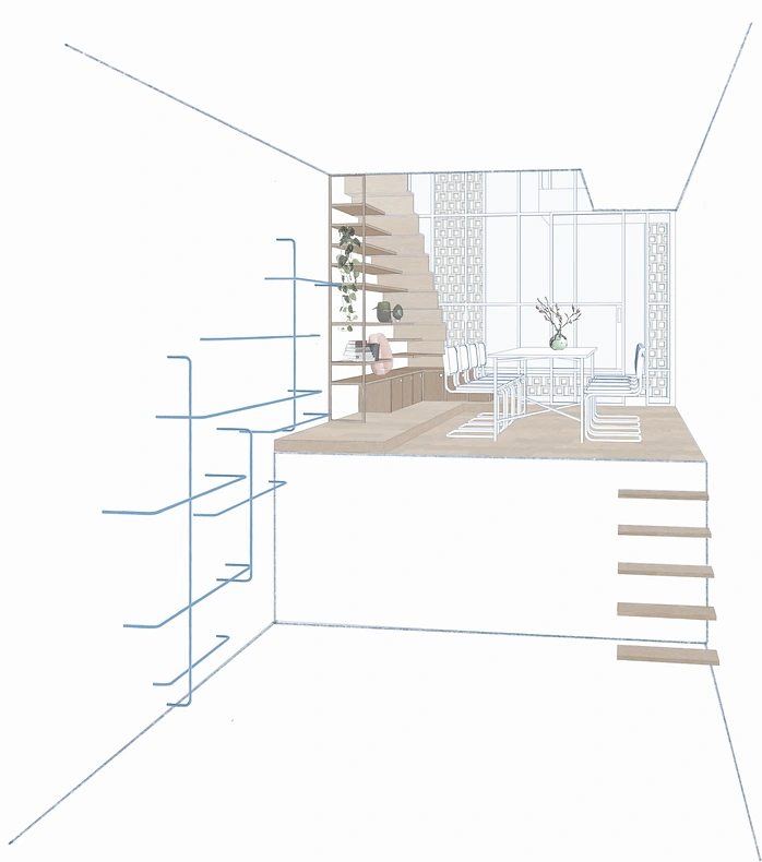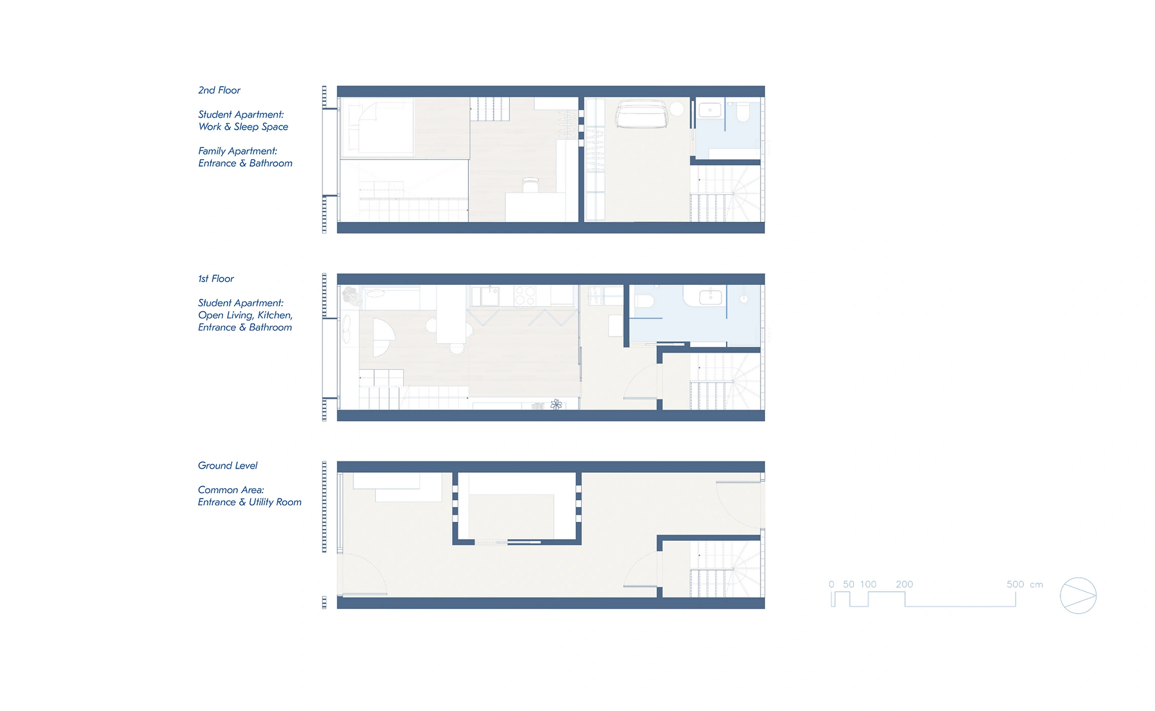The occupants would be a young family of three and a single student. Private as well as communal areas should be available for both parties, always taking care to maintain the right balance between the two.