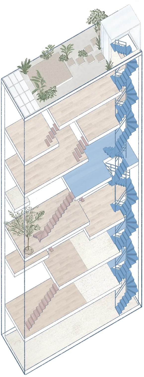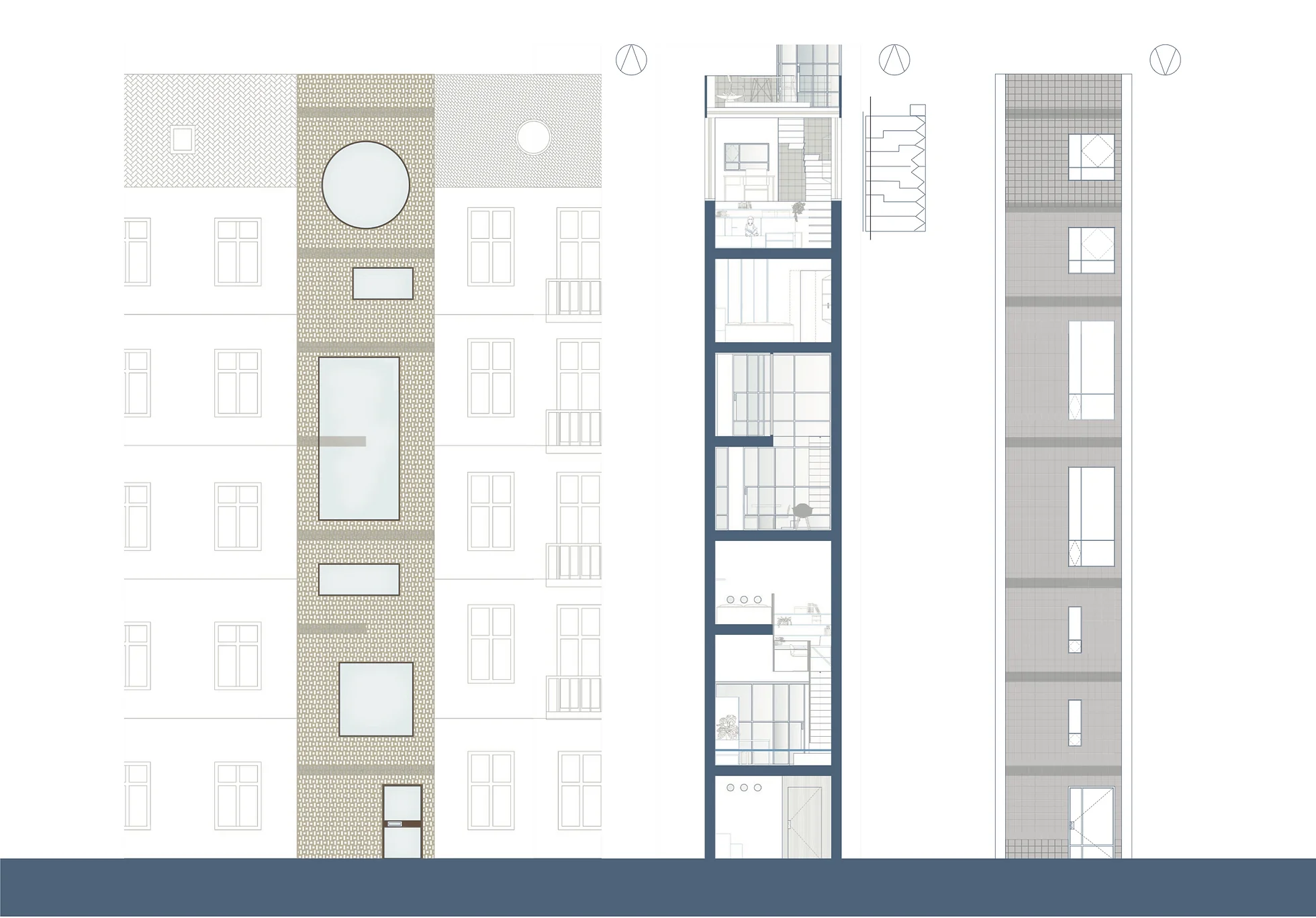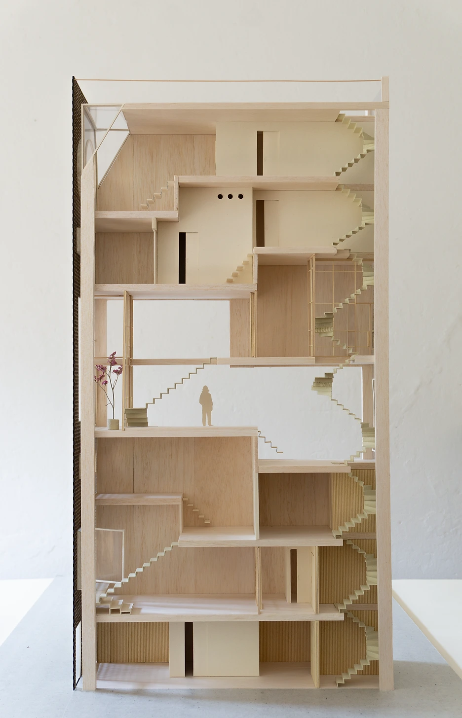 The project's location is a 4-meter-wide gap between two typical Berlin old buildings. With this narrow space and the height of 22 meters, living must be translated from horizontal to vertical.