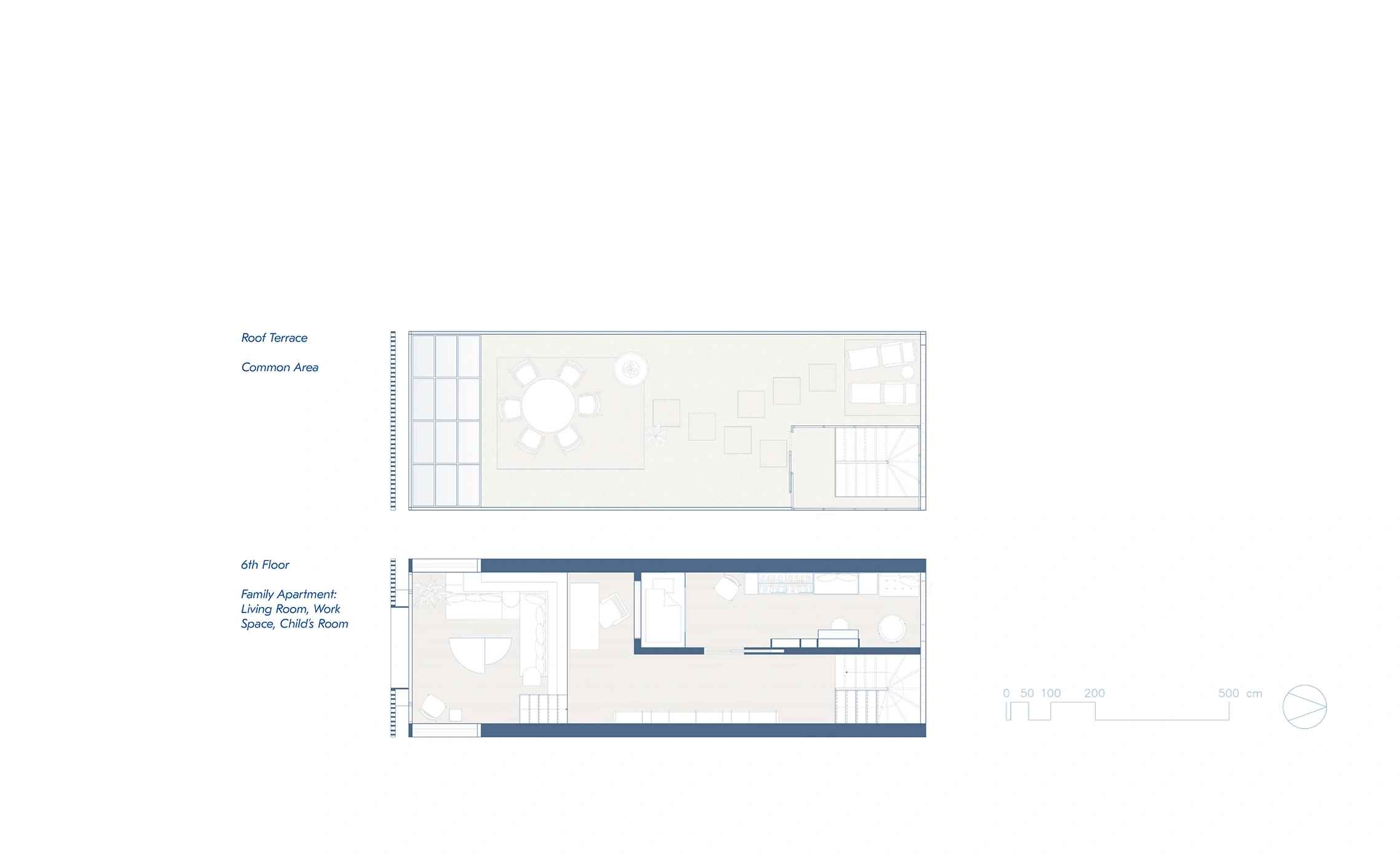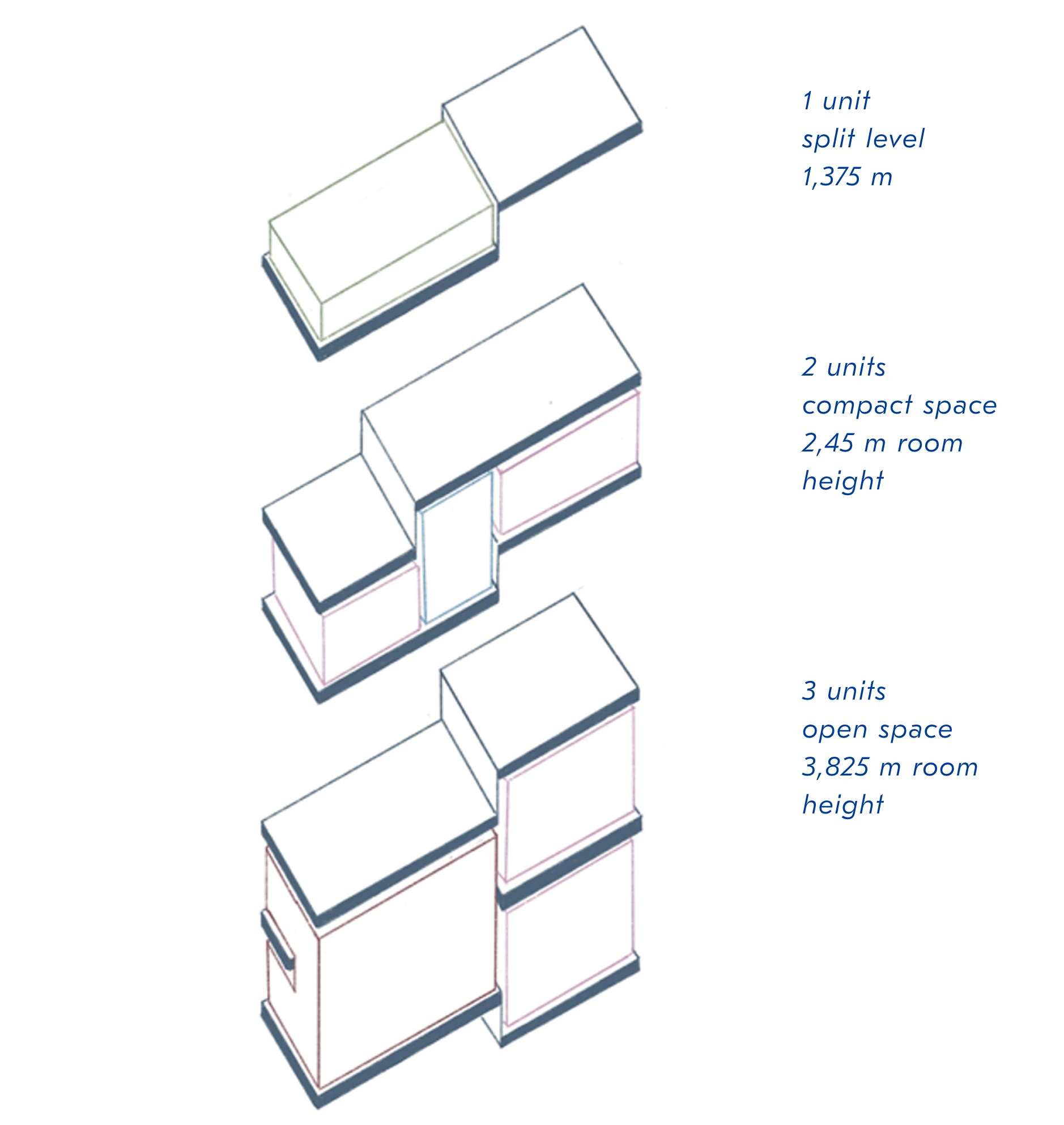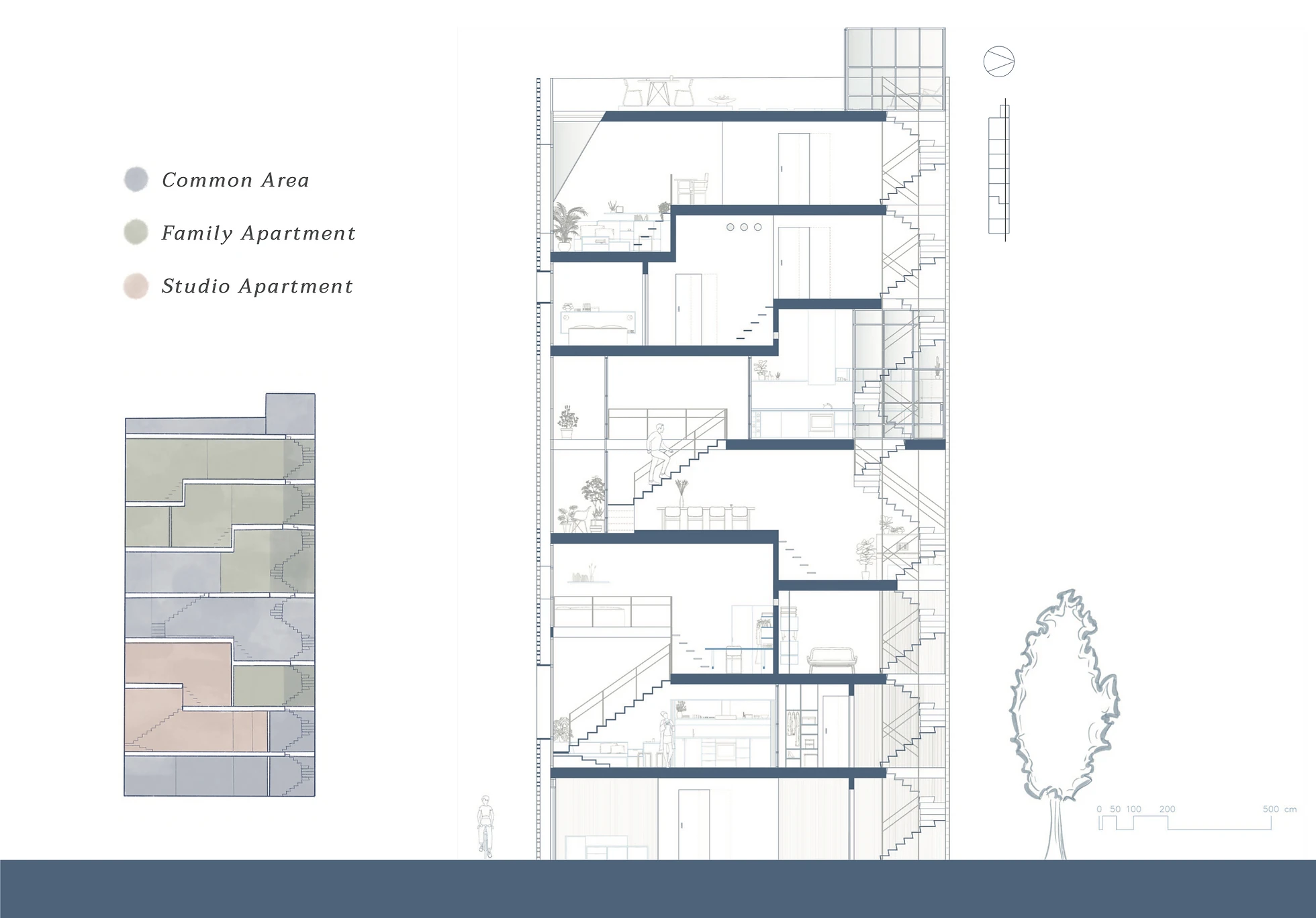 The project's location is a 4-meter-wide gap between two typical Berlin old buildings. With this narrow space and the height of 22 meters, living must be translated from horizontal to vertical.