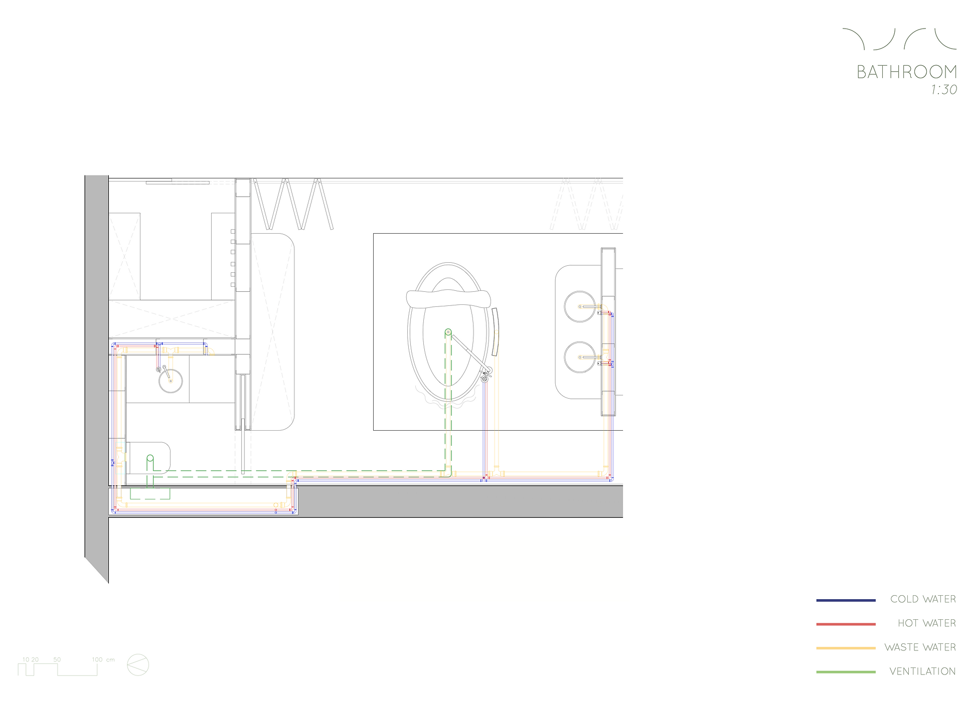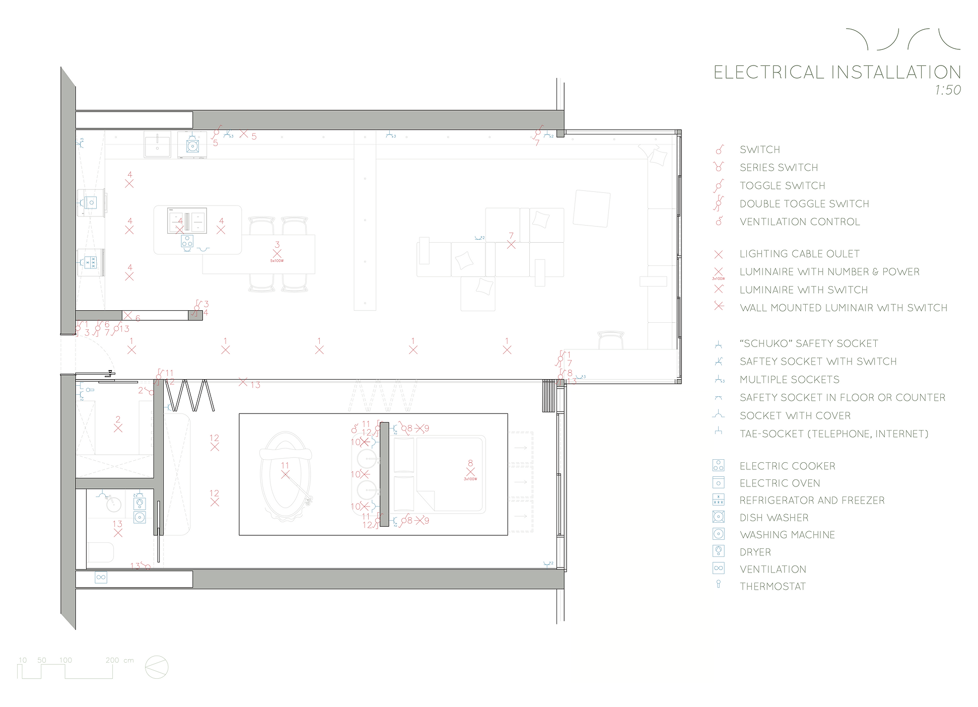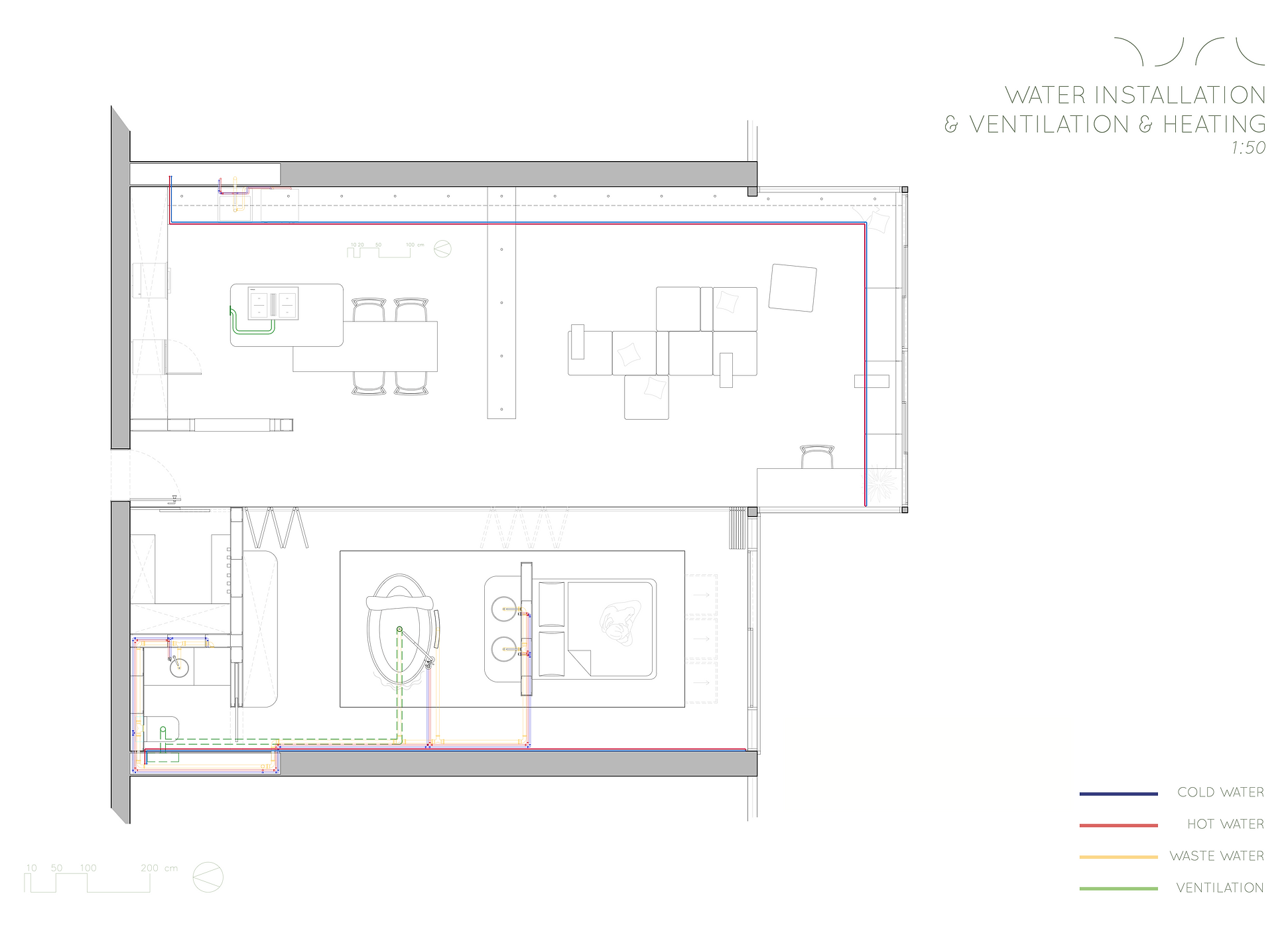 Special attention was paid to a balanced lighting concept that should offer many possibilities for different needs and occasions. The necessary enclosed storage space was created with a separate cloakroom, many drawers set into the living room bench, a large wardrobe and additional drawers in the platforms. In addition, the building services such as electricity, plumbing and heating were carefully planned.