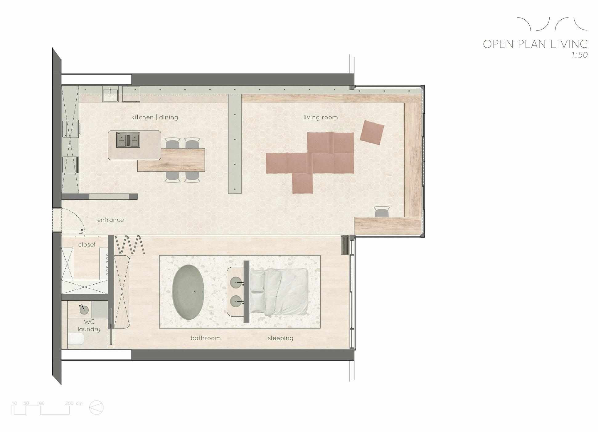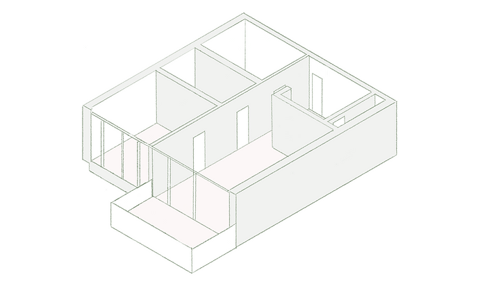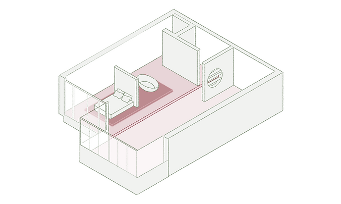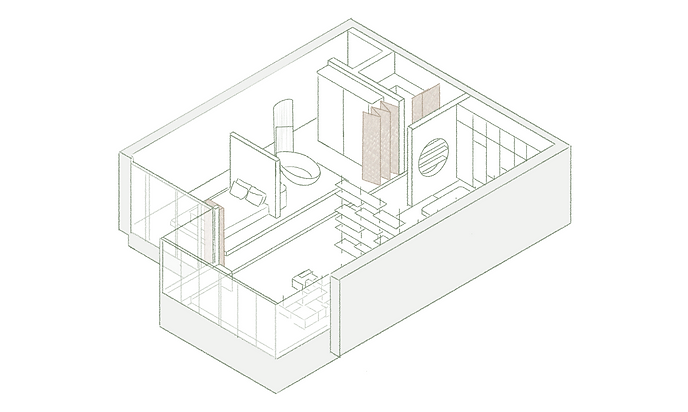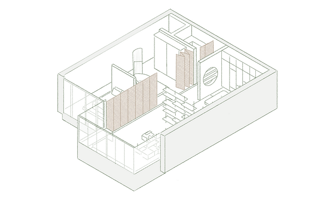The original floor plan included very small, enclosed rooms. The new, open floor plan maximises the space of the apartment, and additional platforms create separate living zones. Folding partitions provide privacy and can be arranged flexibly.