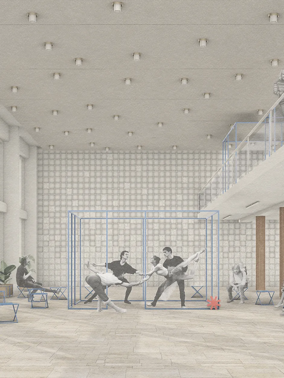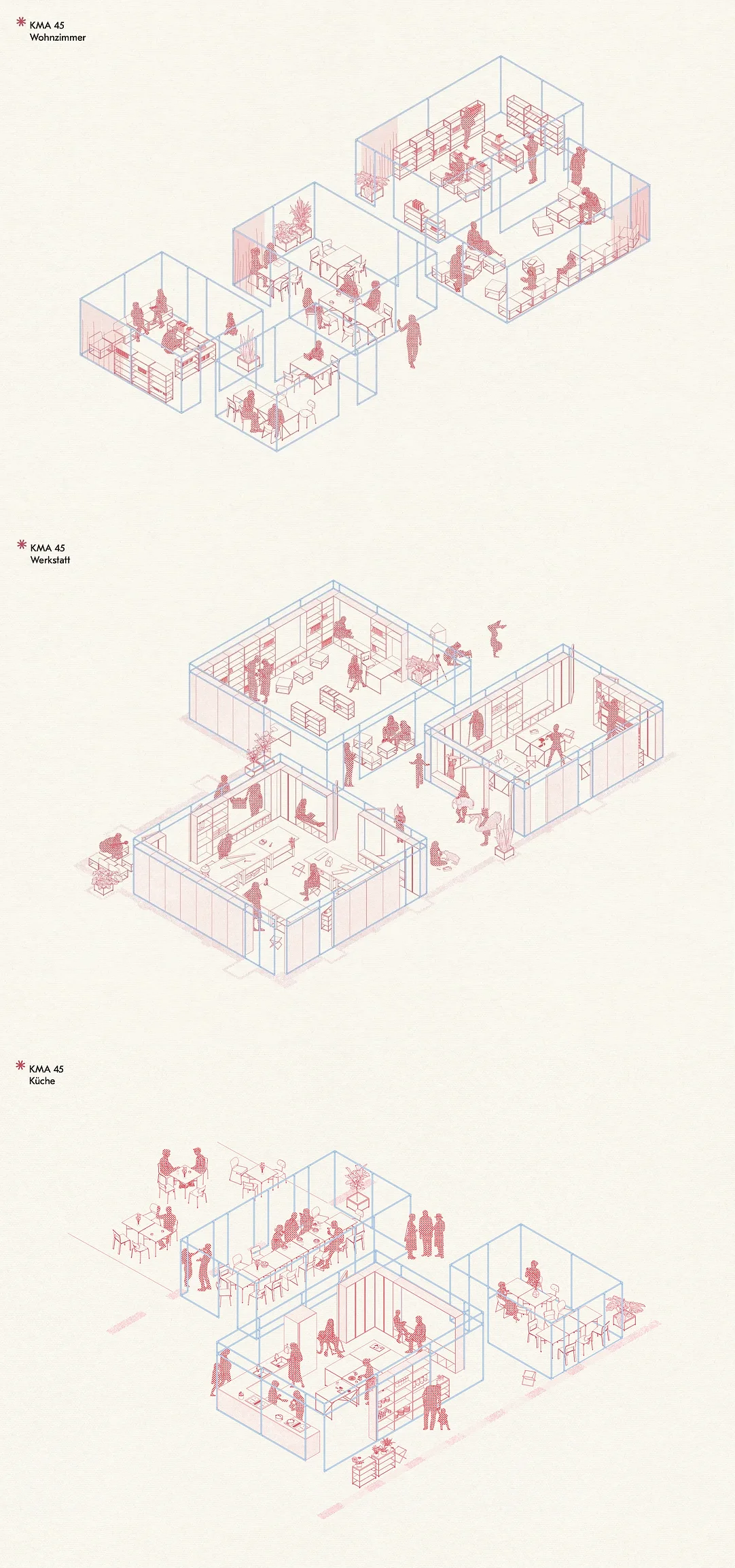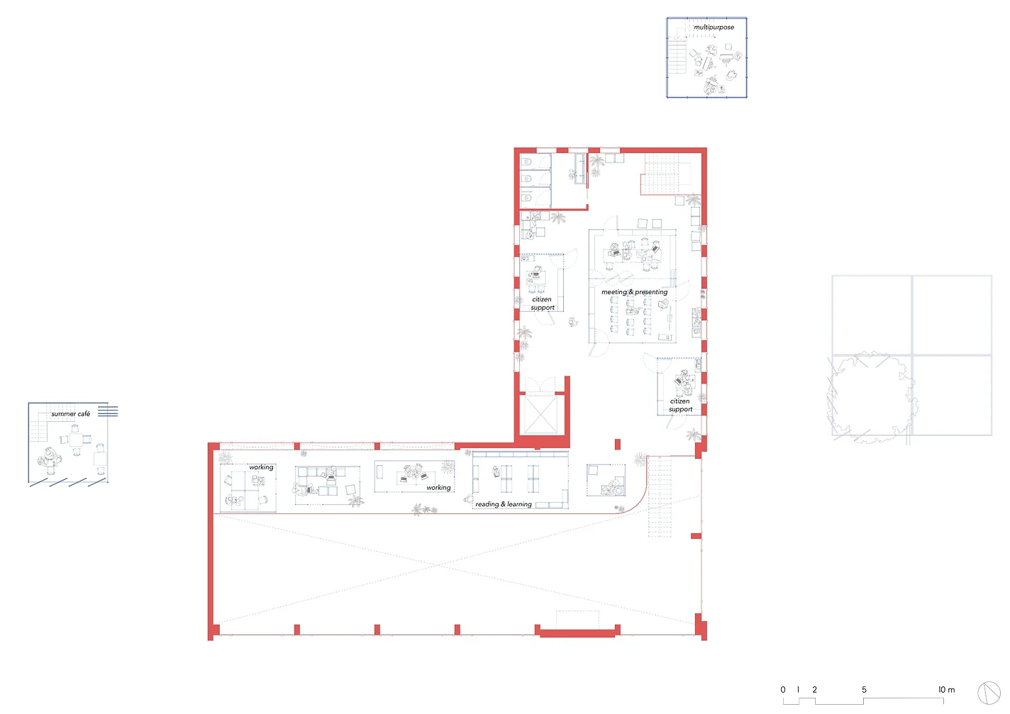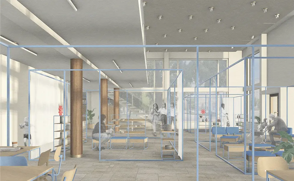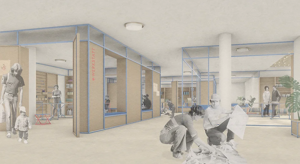 Depending on the function, the frames can be equipped with more or less storage space and necessary appliances. This system will create a 'Wohnzimmer' for meeting, reading and exchanging, a communal 'Küche', citizen support of- fices and 'Werkstatt' spaces in the basement. The arrangement of the frames creates a circulation allowing for much space in between that can be utilised spontaneously.