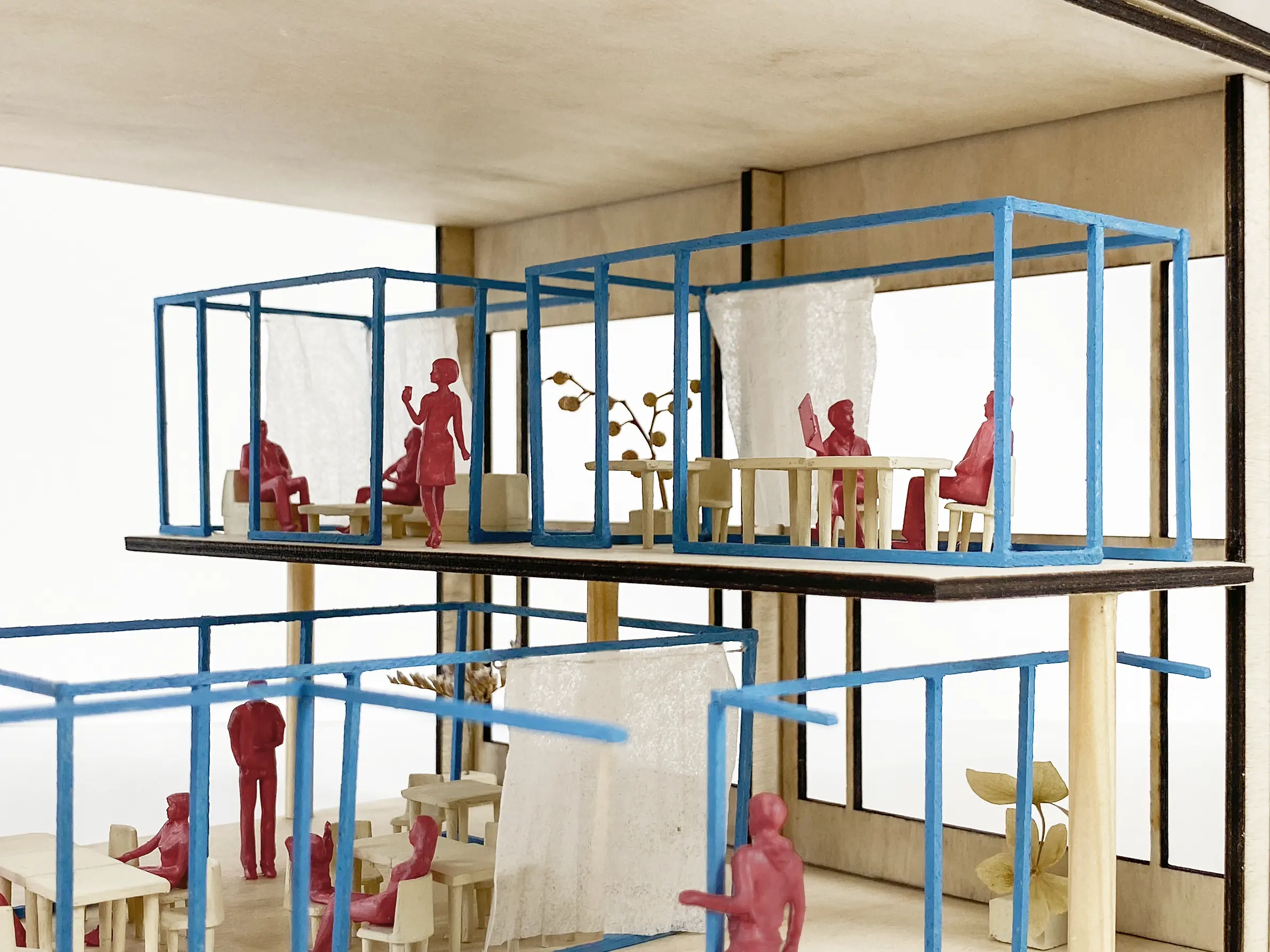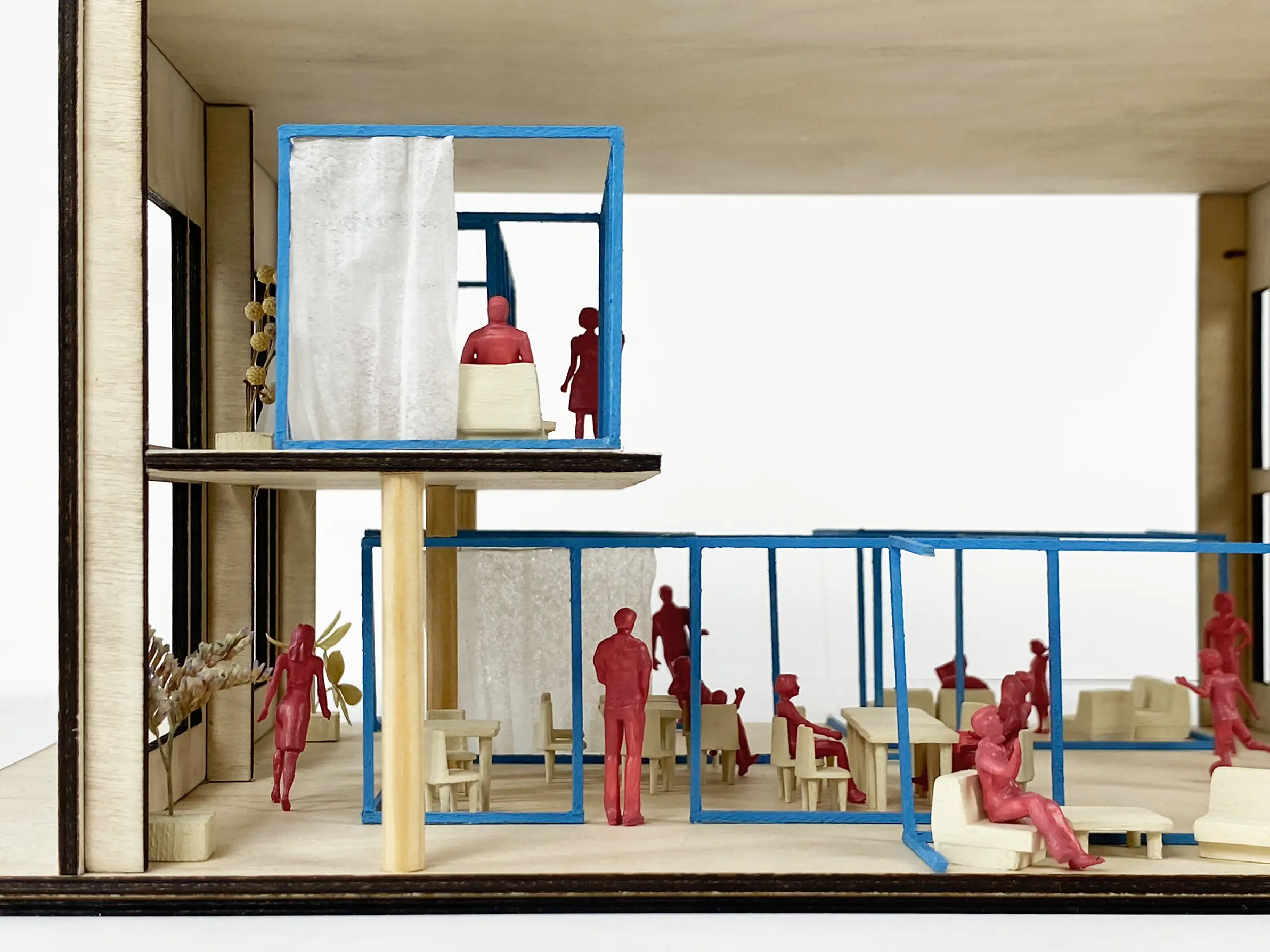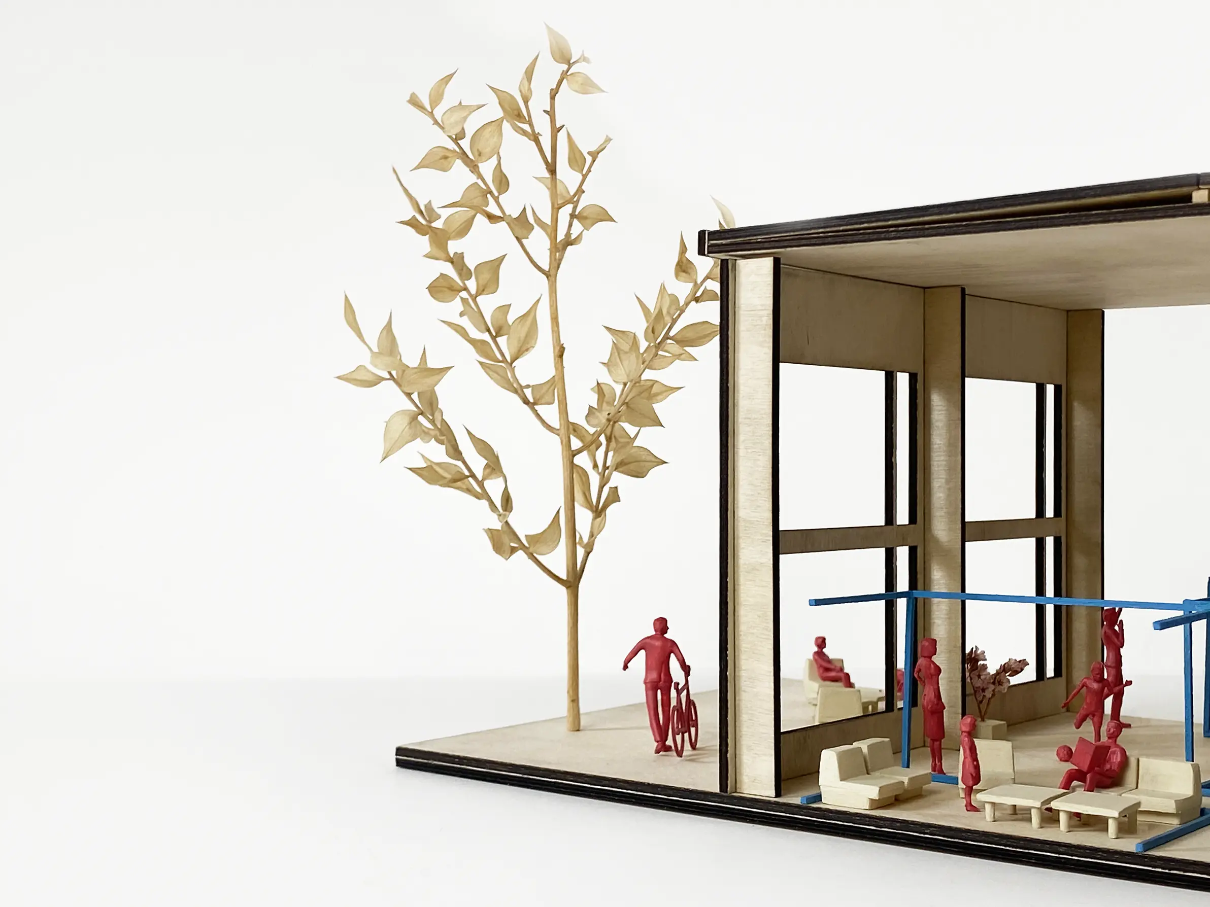 Model 1:50 | Lasercut Birch Plywood, Acryl-Painted Wood Frames, Chalk-Painted Polystyrol Furniture, Acryl-Painted Polystyrol People
