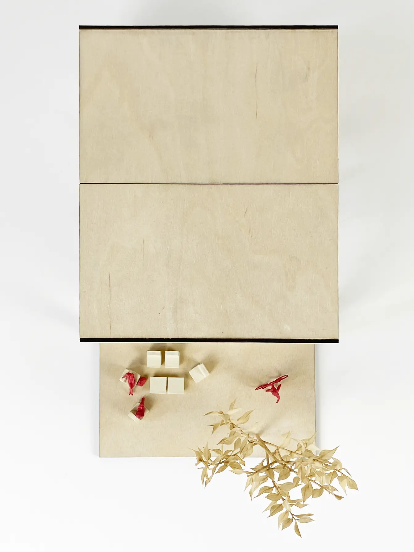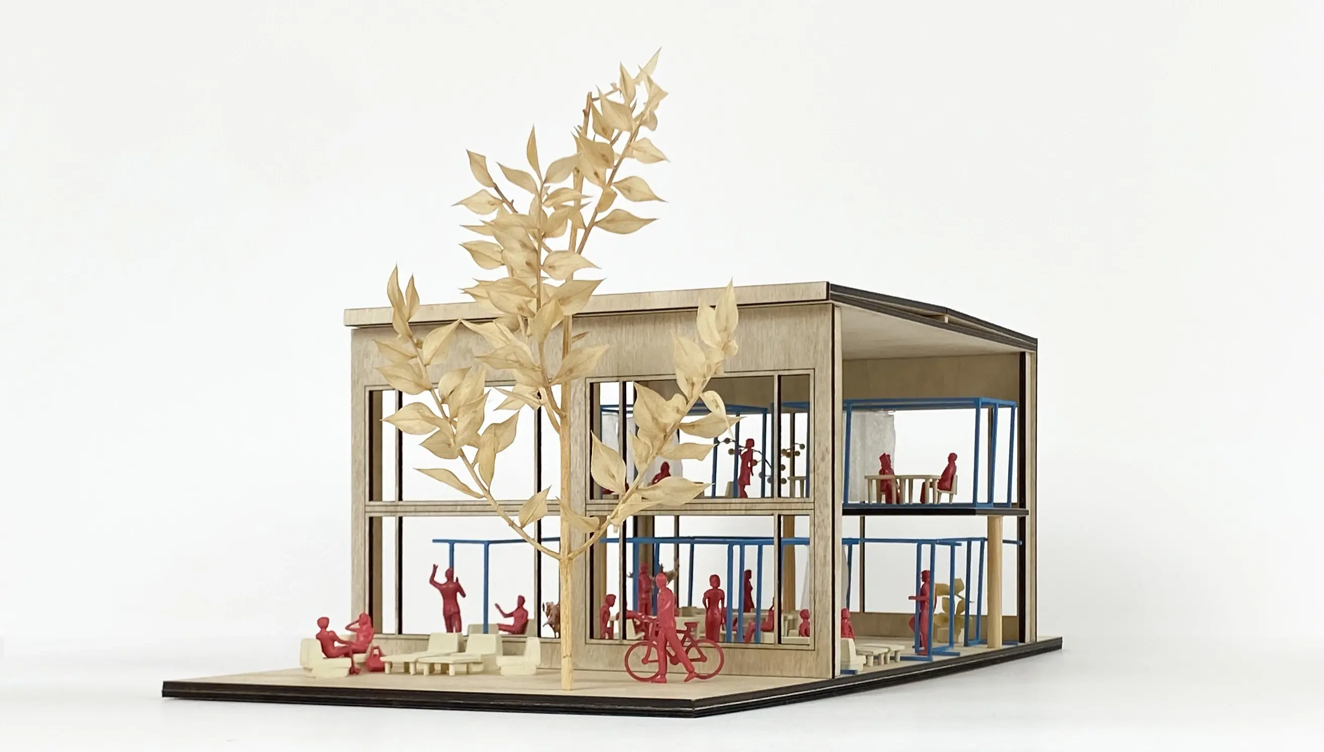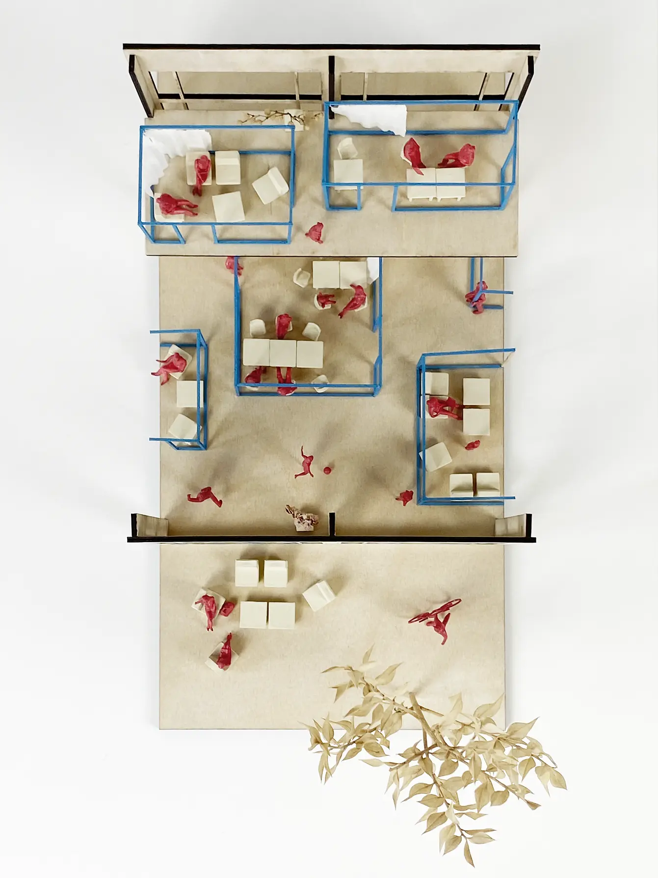 Model 1:50 | Lasercut Birch Plywood, Acryl-Painted Wood Frames, Chalk-Painted Polystyrol Furniture, Acryl-Painted Polystyrol People