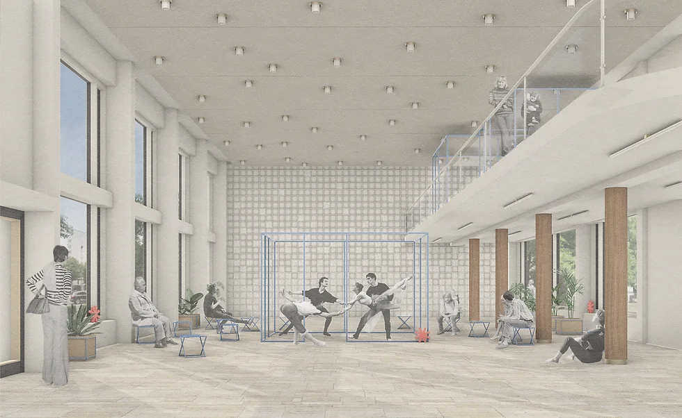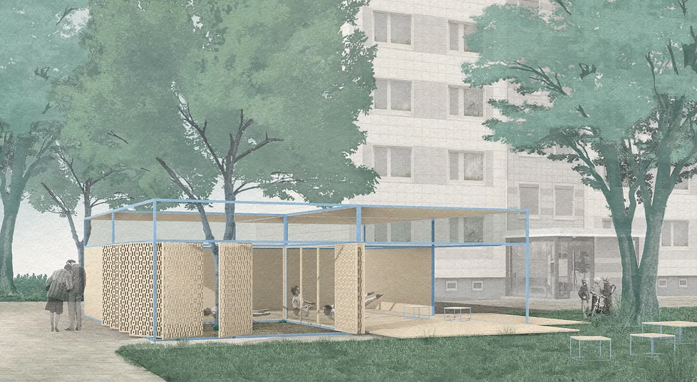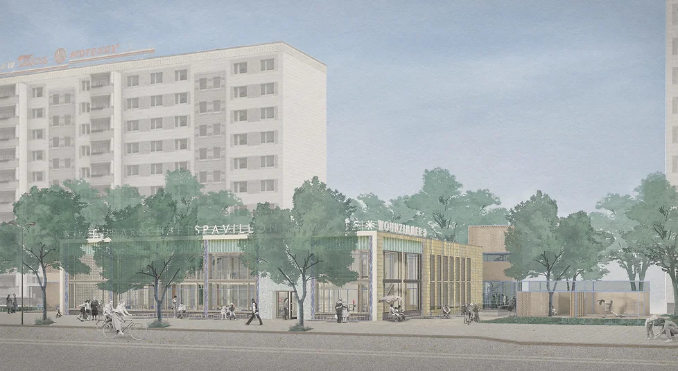 The project reimagines one of the GDR pavilions on Karl-Marx-Allee in Berlin as a community centre urgently