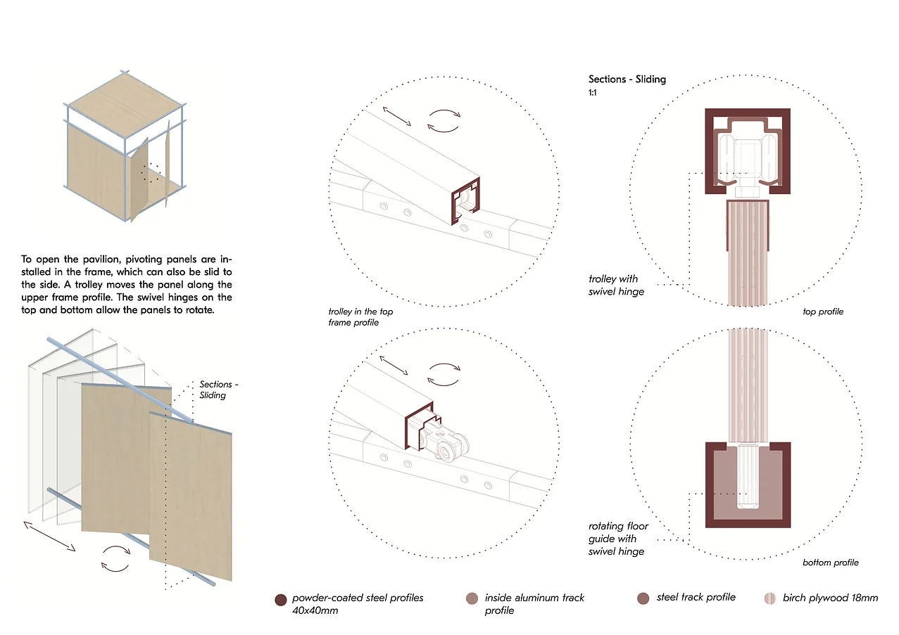 An example of a temporary pavilion. The frames are filled with fixed panels