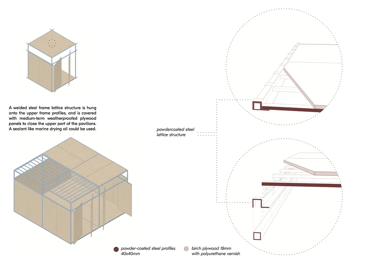 In the following visualisations, only examples of possible set-ups are shown, representing an ever-changing village that is defined by the unobtrusive frames but only comes to life when people inhabit the space. The system expands outwards and allows people to occupy the surroundings.