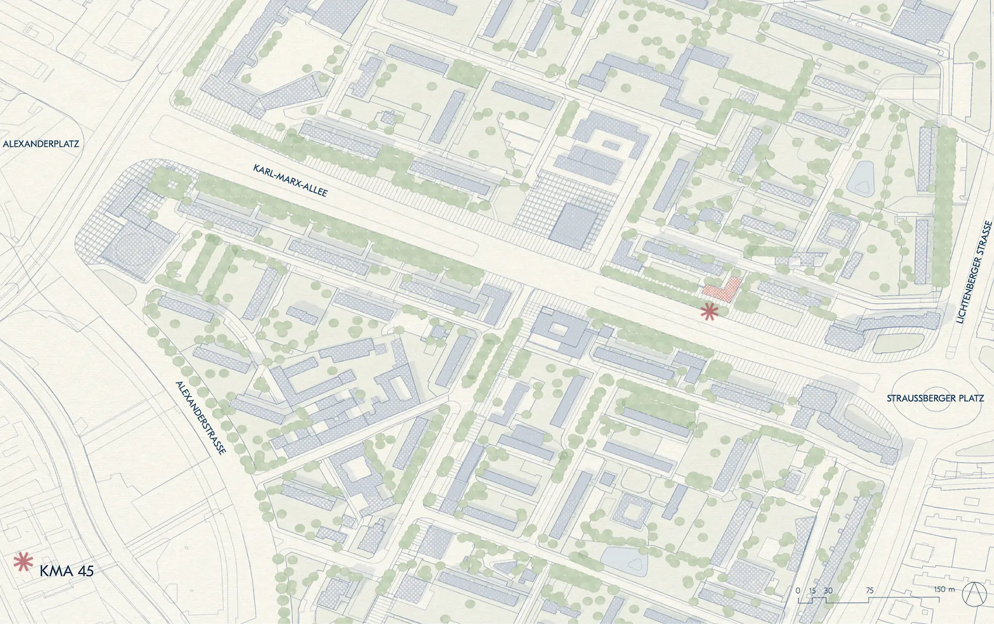 The "KMA 45 Nachbarschaftspavillon" seen from the Karl-Marx-Allee; a meeting place,